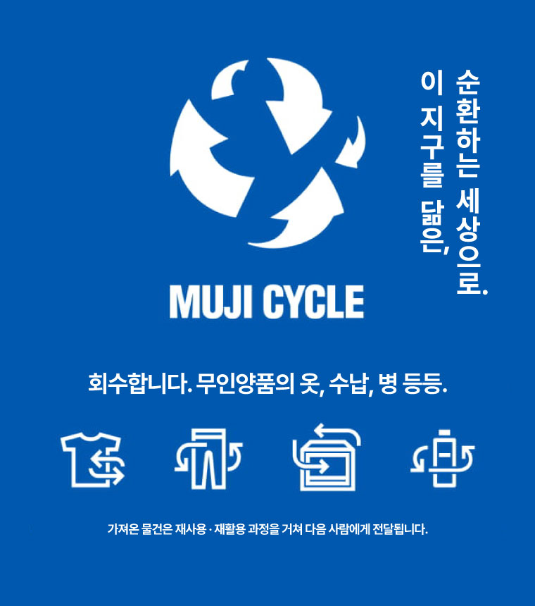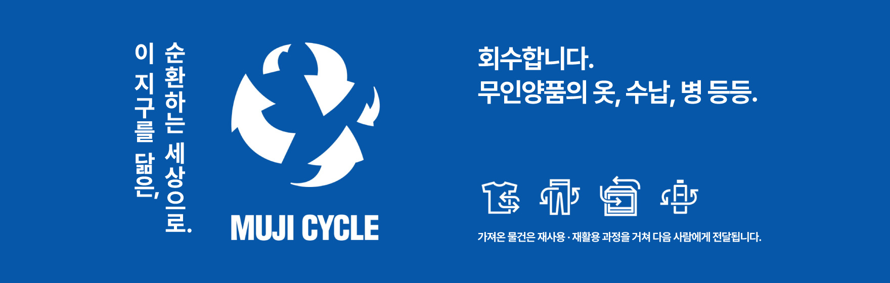 MUJI CYCLE우리에게 없어서는 안 될 지구와 천연자원이 앞으로도 무리없이 순환할 수 있기를 바랍니다.