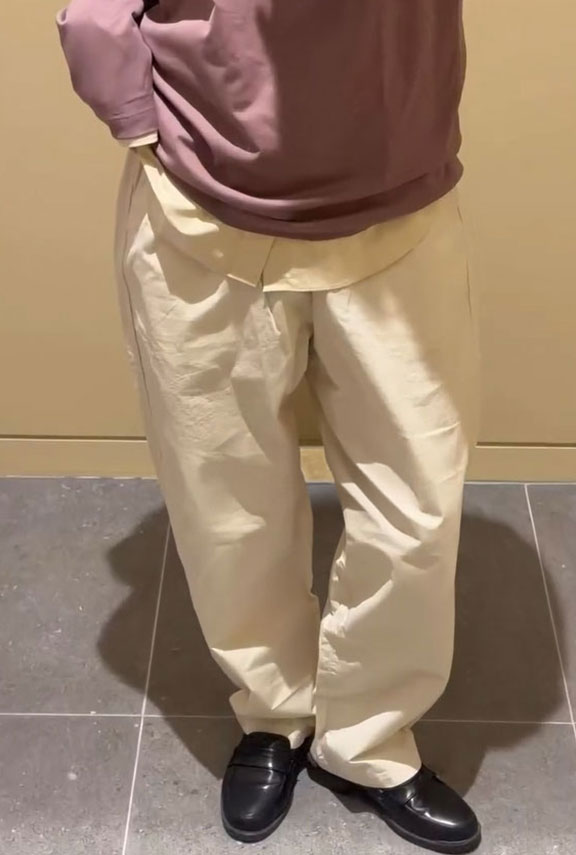 코디에서 느껴지듯 상의는 심플하게 입어도 전체적인 분위기가 살아나는 이유는 팬츠 핏이 중심을 잡아주기 때문이에요.
