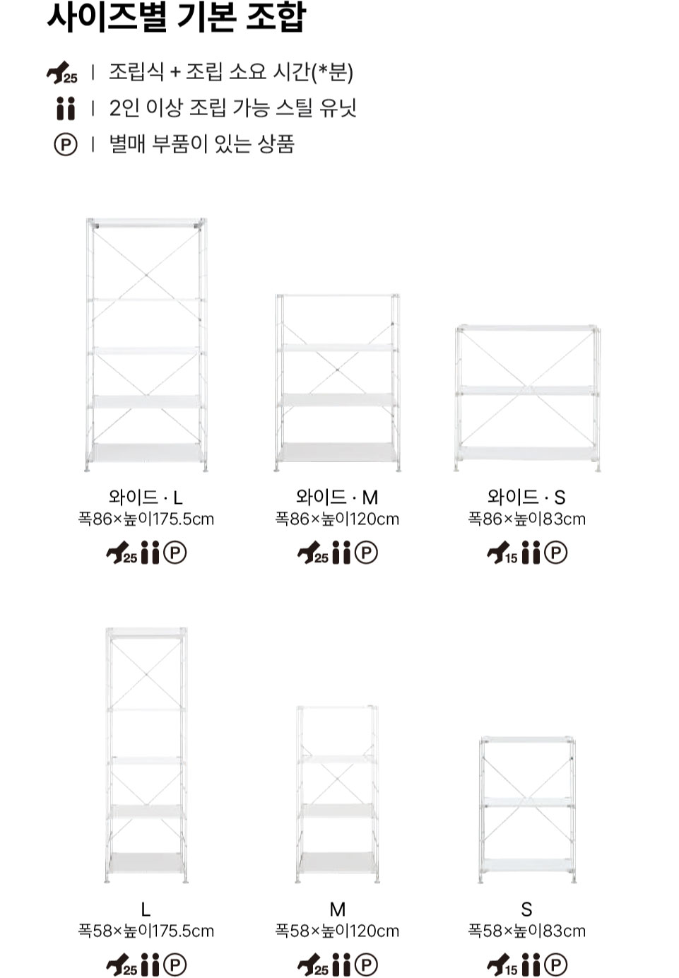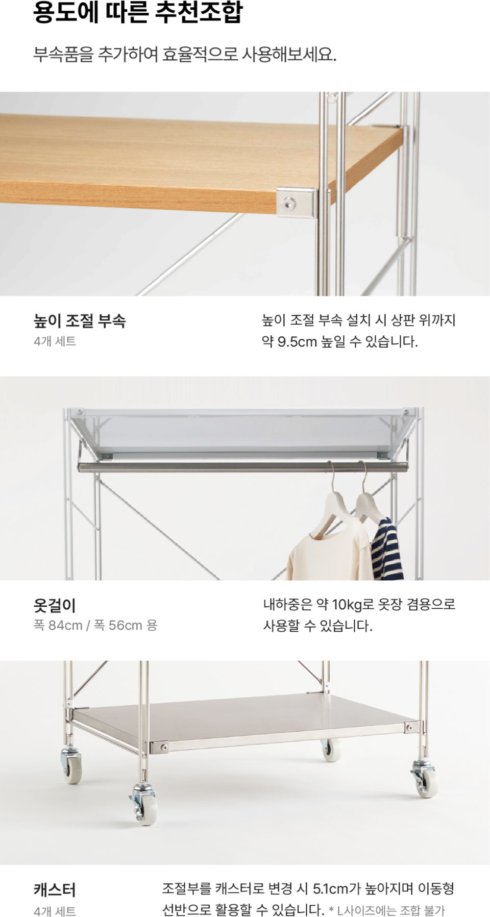 용도에 따라 선반, 옷걸이, 캐스터 등 부품을 자유롭게 조합할 수 있습니다.