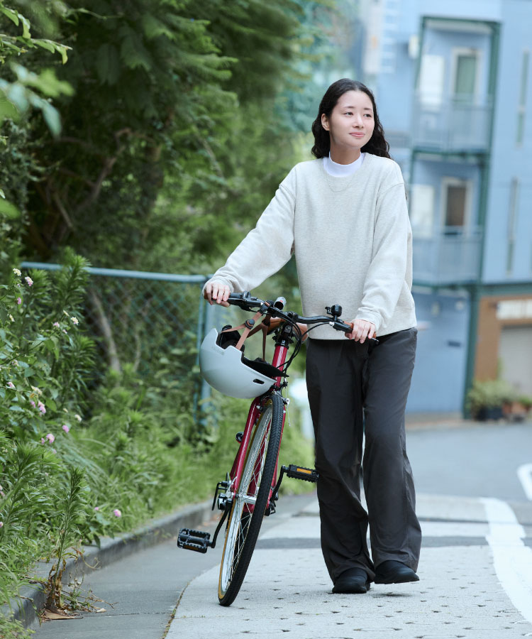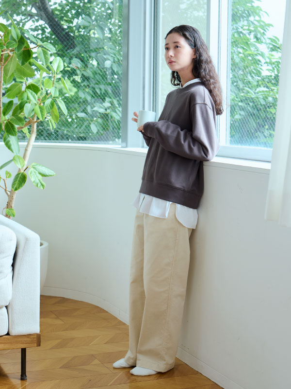 서늘한 계절을 스웨트 셔츠로 포근하게 느껴보세요. 낮 기온이 올라가도 부담 없이 얇게 입을 수 있는 코디입니다.