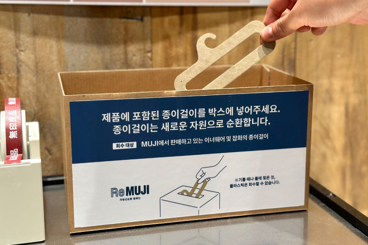 무인양품 전 매장 계산대 옆에 비치된 종이걸이 회수함에 쓰임을 다한 종이걸이를 넣을 수 있습니다.