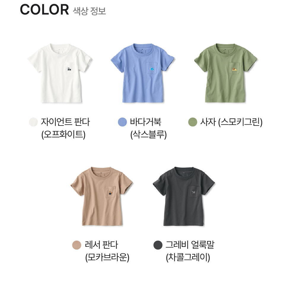 그레비얼룩말(차콜그레이),사자(스모키그린),바다거북(삭스블루),안데스플라밍고(코럴),레서판다(모카브라운),자이언트판다(오프화이트)
