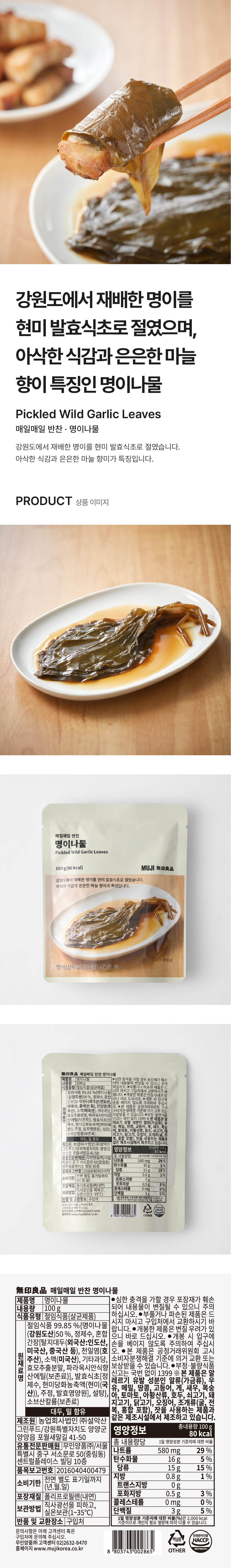 절임식품 99.85%{명이나물(강원도산)50%, 정제수, 혼합간장[탈지대두(외국산:인도산,미국산,중국산 등), 천일염(호주산), 소맥(미국산), 기타과당, 효모추출분말, 파라옥시안식향산에틸(보존료)], 발효식초[정제수, 현미당화농축액(현미(국산)), 주정, 발효영양원], 설탕}, 소브산칼륨(보존료)