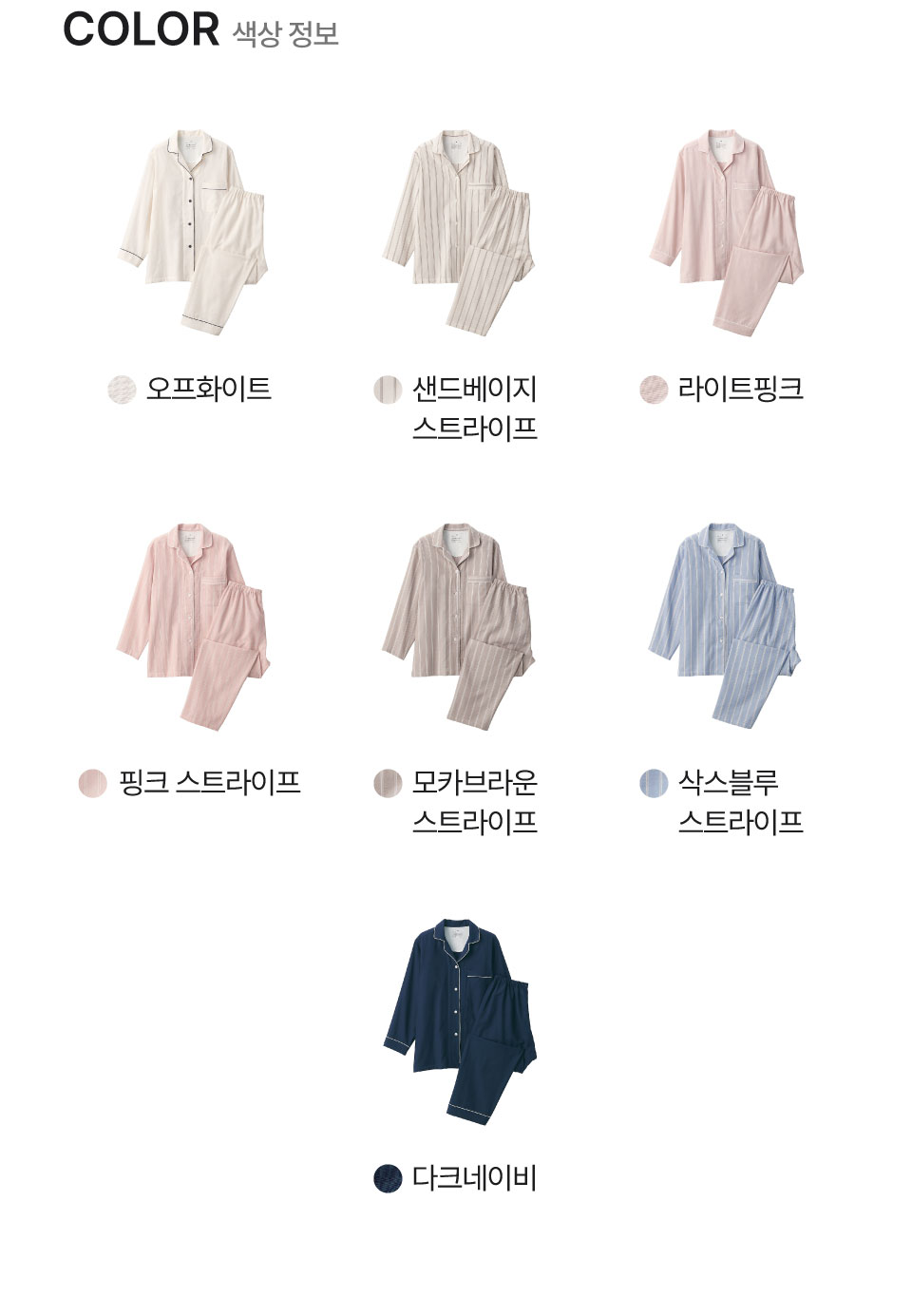 라이트핑크,핑크 스트라이프,샌드베이지 스트라이프,모카브라운 스트라이프,다크네이비,삭스블루 스트라이프,오프화이트