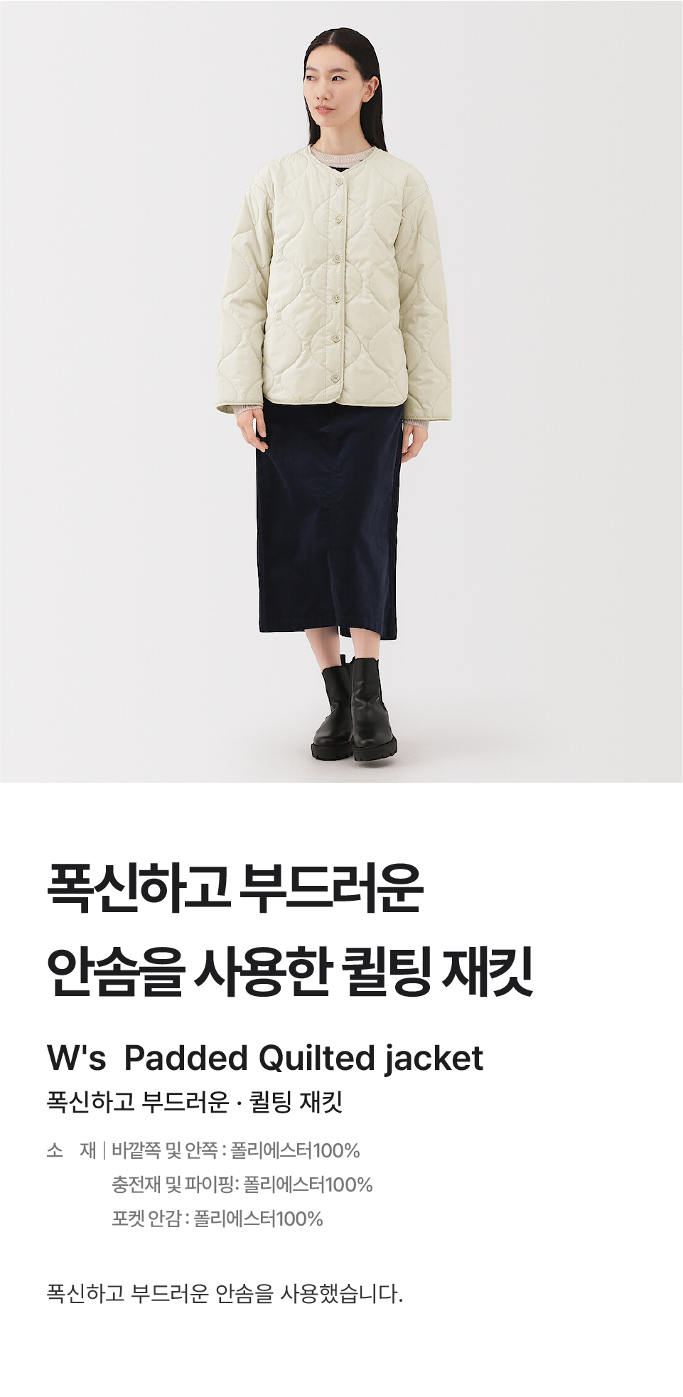 바깥쪽:폴리에스터100%,충전재:폴리에스터100%,안쪽:폴리에스터100%,파이핑:폴리에스터100%,포켓 안감(안쪽):폴리에스터100%,포켓 안감(바깥쪽):폴리에스터100%