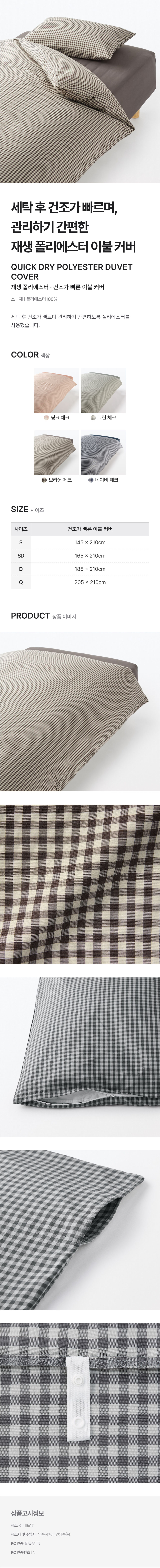 재생 폴리에스터 건조가 빠른 이불 커버 브라운체크 S/4547315512157
