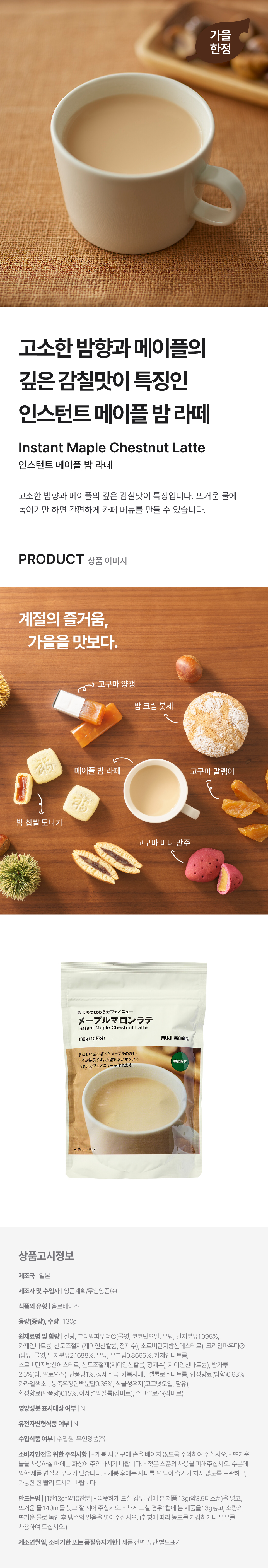 원재료명 및 함량:설탕, 크리밍파우더①(물엿, 코코넛오일, 유당, 탈지분유1.095%, 카제인나트륨, 산도조절제(제이인산칼륨, 정제수), 소르비탄지방산에스테르), 크리밍파우더②(팜유, 물엿, 탈지분유2.1688%, 유당, 유크림0.8666%, 카제인나트륨, 소르비탄지방산에스테르, 산도조절제(제이인산칼륨, 정제수), 제이인산나트륨), 밤가루2.5%(밤, 말토오스), 단풍당1%, 정제소금, 카복시메틸셀룰로스나트륨, 합성향료(밤향)0.63%, 카라멜색소 I, 농축유청단백분말0.35%, 식물성유지(코코넛오일, 팜유), 합성향료(단풍향)0.15%, 아세설팜칼륨(감미료), 수크랄로스(감미료)