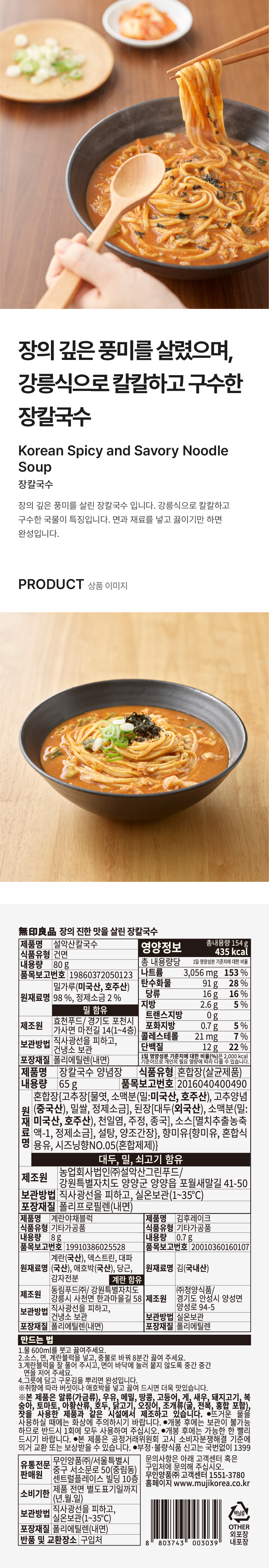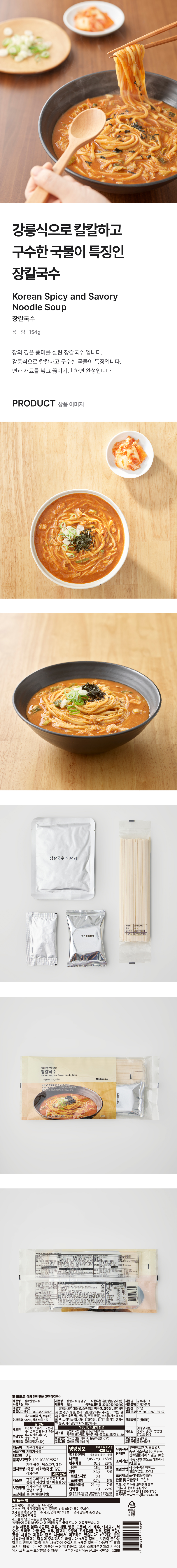 원재료명 및 함량)*장칼국수: 154g(설악산칼국수 80g, 장칼국수 양념장 65g, 계란야채블럭 8g, 김후레이크 0.7g)*설악산칼국수: 밀가루(미국산,호주산) 98%, 정제소금 2% "밀 함유"*장칼국수 양념장: 혼합장{고추장[물엿, 소맥분(밀:미국산, 호주산), 고추양념(중국산), 밀쌀, 정제소금], 된장[대두(외국산), 소맥분(밀:미국산,호주산), 천일염, 주정, 종국], 소스[멸치추출농축액-1, 정제소금], 설탕, 양조간장}, 향미유{향미유, 혼합식용유, 시즈닝향NO.05(혼합제제)} "대두,밀,쇠고기 함유"*계란야채블럭: 계란(국산), 덱스트린, 대파(국산), 애호박(국산), 당근, 감자전분 "계란 함유"*김후레이크: 김(국내산)