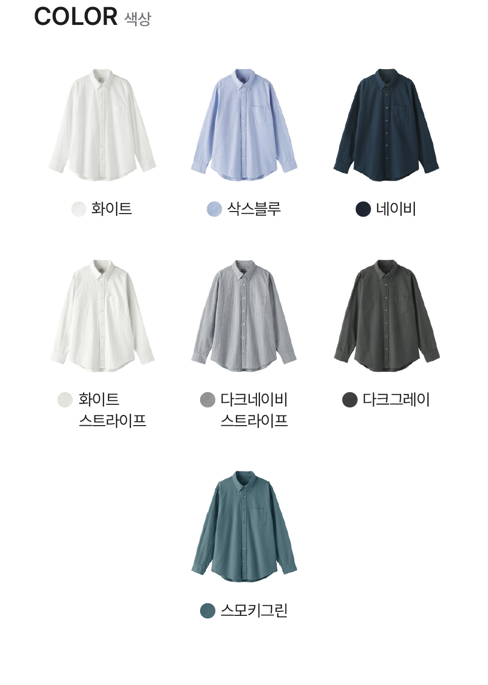 화이트,네이비,스모키그린,삭스블루,화이트 스트라이프,다크그레이,다크네이비 스트라이프