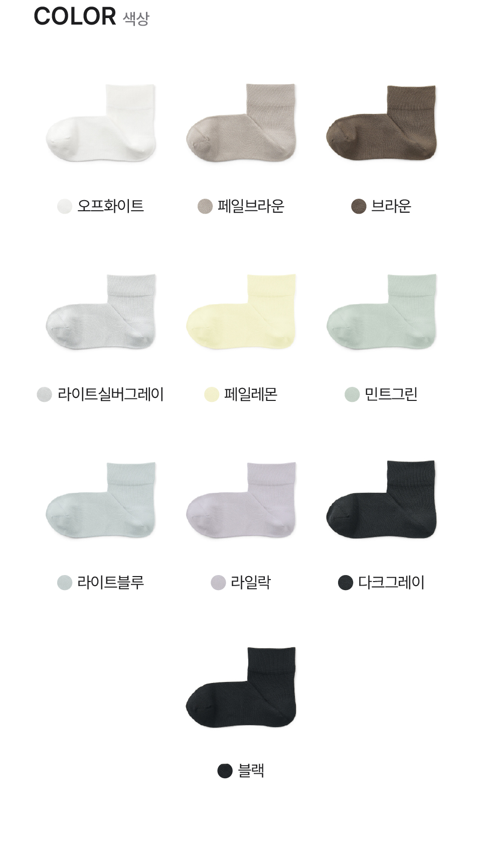 페일레몬,민트그린,라이트블루,라일락,오프화이트,라이트실버그레이,다크그레이,블랙,페일브라운,브라운