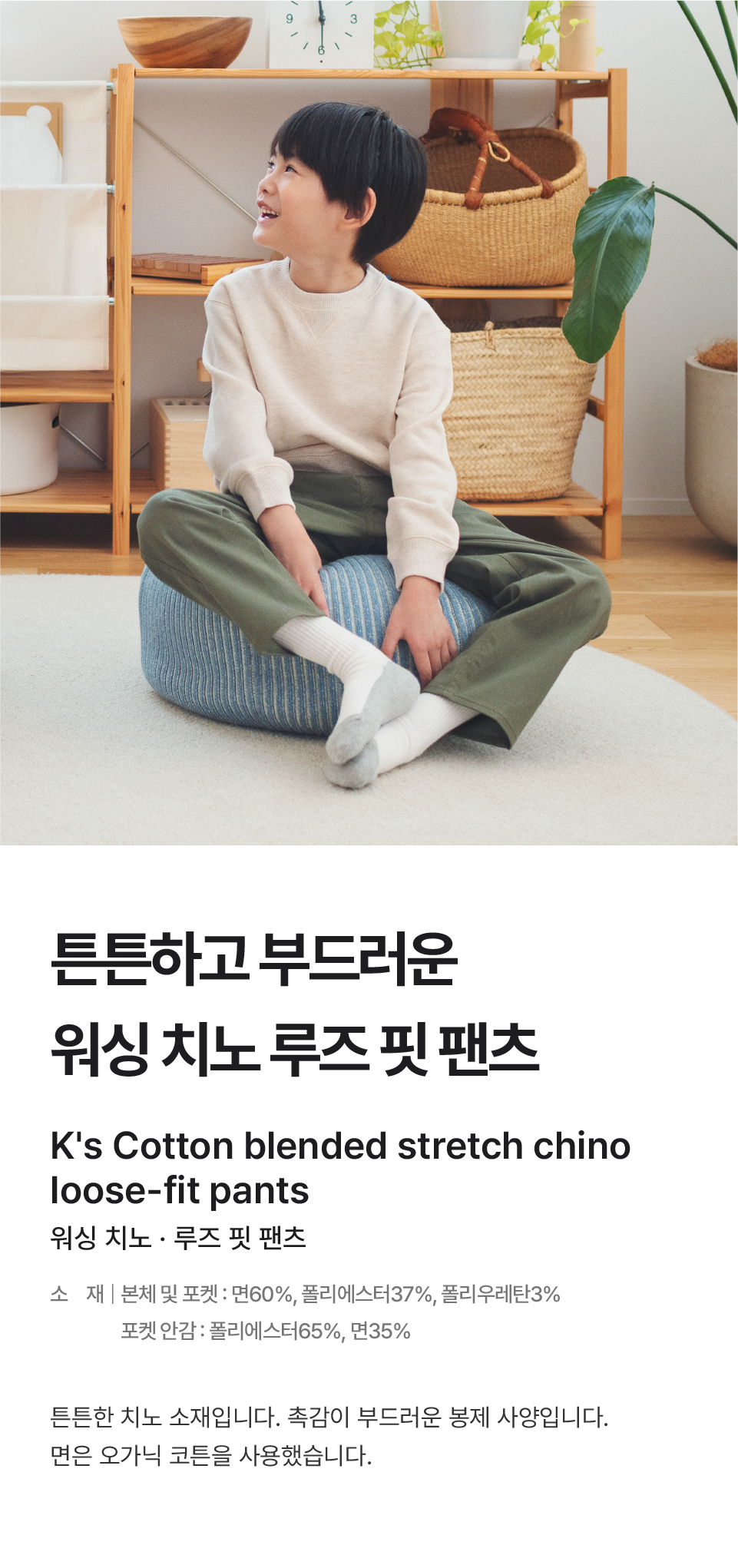 본체, 포켓:면60%/폴리에스터37%/폴리우레탄3%,포켓 안감:폴리에스터65%/면35%