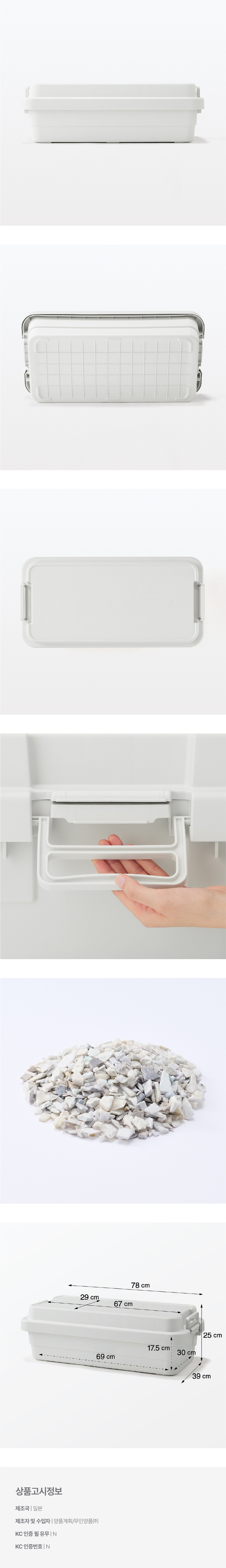 약 78x39x25cm / 적층 가능 단수 : 3단 / 중량 :약 3.4kg / 내용물 : 약 40L / 내하중 : 뚜껑 약 100kg, 수납부 약 16kg