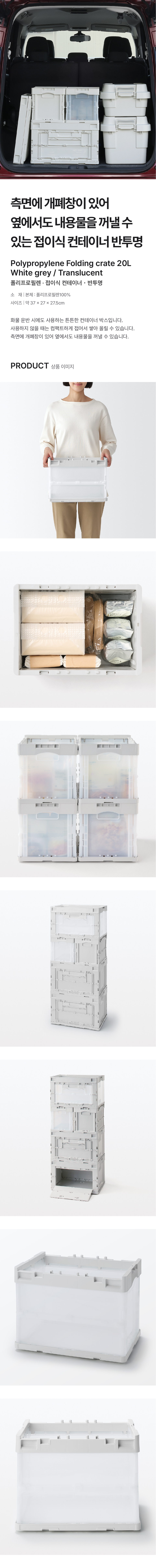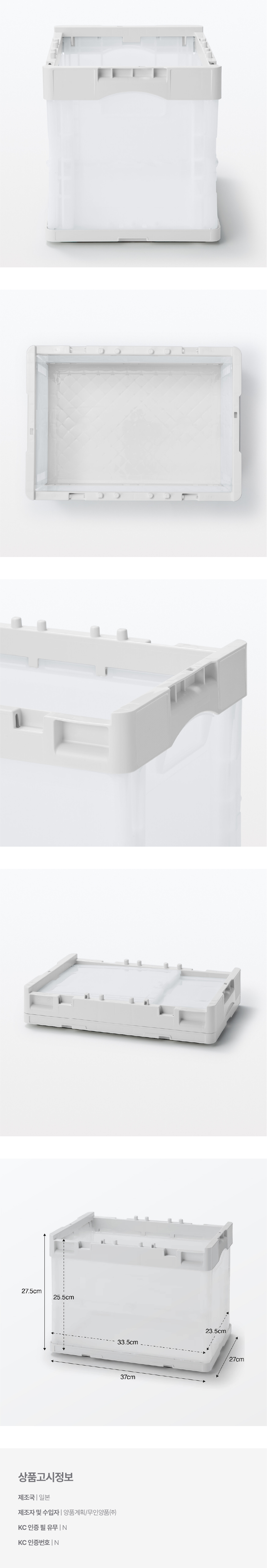 약 37x27x27.5cm / 적층 가능 단수 : 4단 / 중량 : 약 1.2kg / 내용물 : 약 20L / 내하중 : 약 10kg