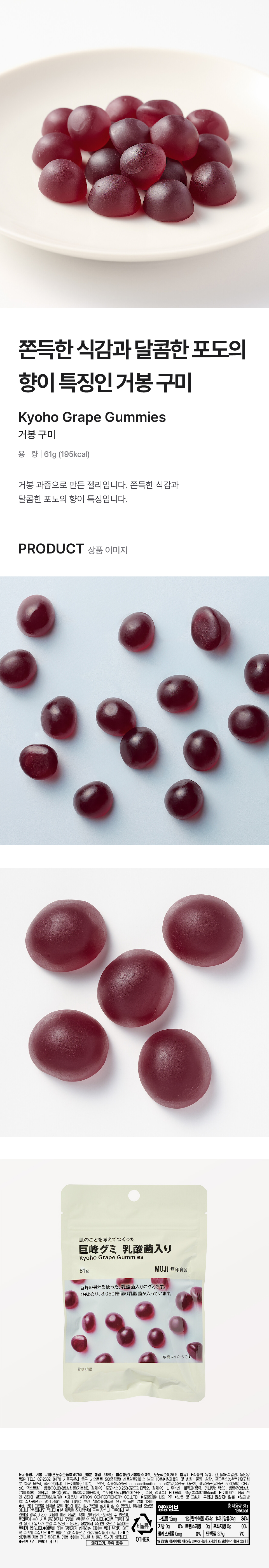 원재료명 및 함량:물엿, 설탕, 포도주스농축액7%, 젤라틴(돼지), D-소비톨(감미료), 구연산, 식물성유산균[Lacticaseibacillus casei분말(유산균 사균체, 생유산균(유산균 500(5백) CFU/g)), 덱스트린], 향료①0.3%(합성향료(거봉향), 정제수), 포도색소0.25%(포도과피색소, 정제수), L-주석산, 피막제(팜유, 카나우바왁스), 향료➁(합성향료(부추향), 정제수), 향료③(팜유, 합성향료(버터향)), 소포제(자당지방산에스테르, 주정, 정제수)
