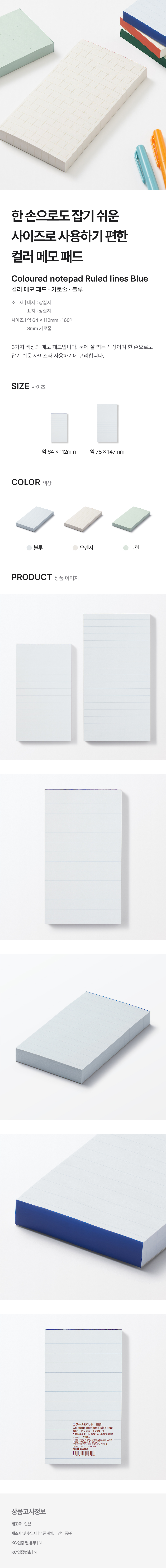 컬러 메모 패드 · 가로줄 블루 약 64x112mm · 160매/4550584476228