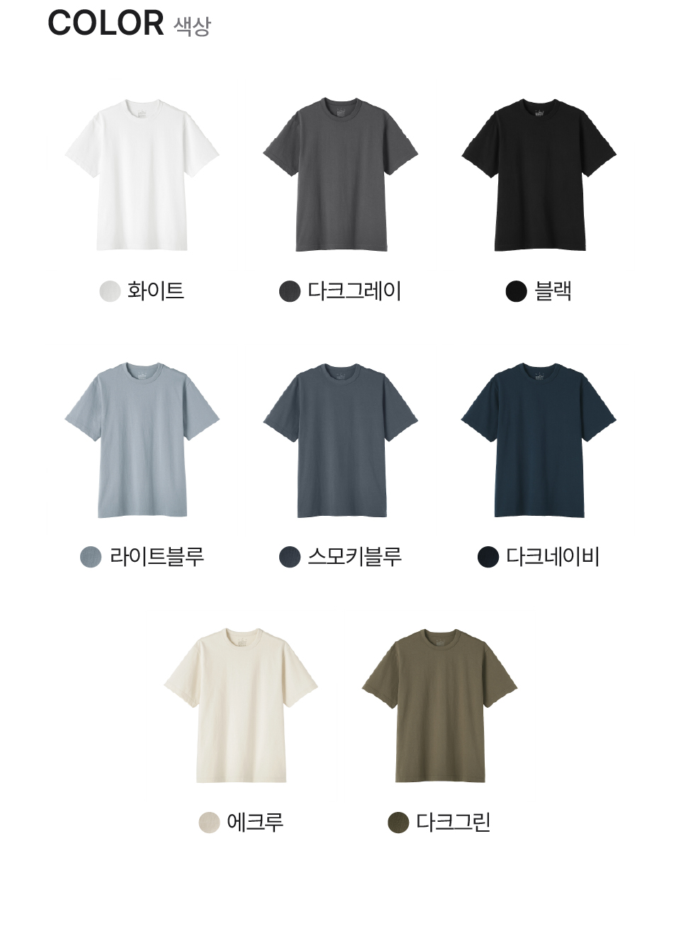 다크네이비,라이트블루,에크루,다크그레이,스모키블루,다크그린,화이트,블랙