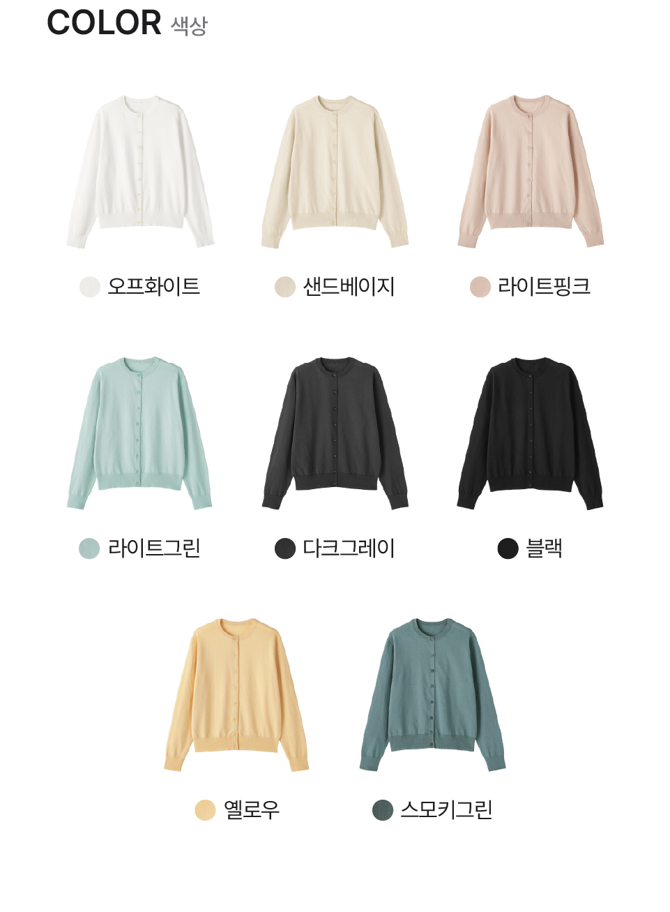오프화이트,블랙,옐로우,스모키그린,샌드베이지,라이트핑크,다크그레이,라이트그린