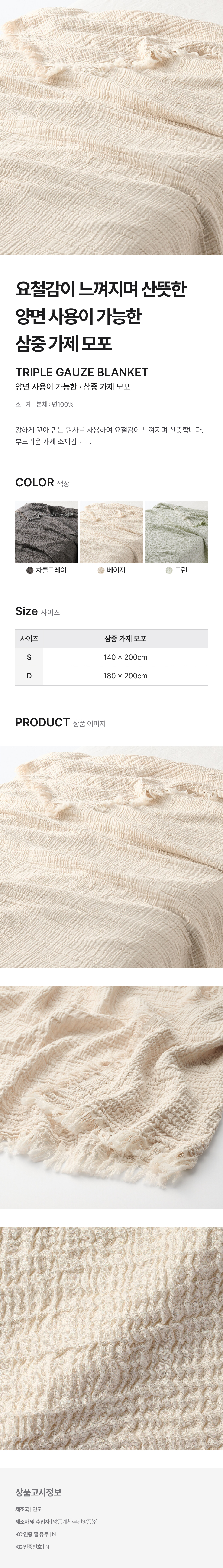 양면 사용이 가능한 삼중 가제 모포 베이지 D/4548076431572