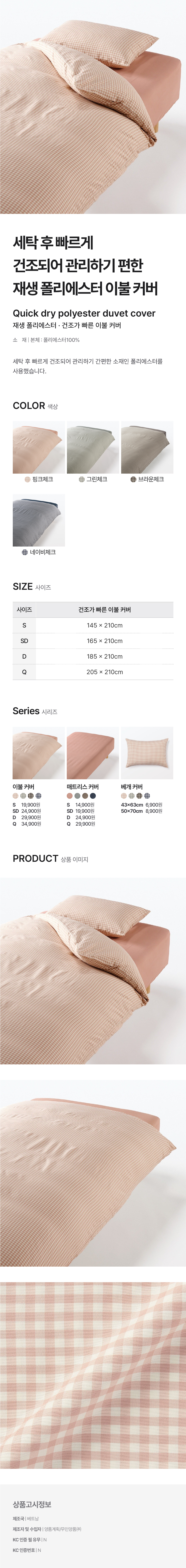 재생 폴리에스터 건조가 빠른 이불 커버 핑크 체크 SD/4548076196785