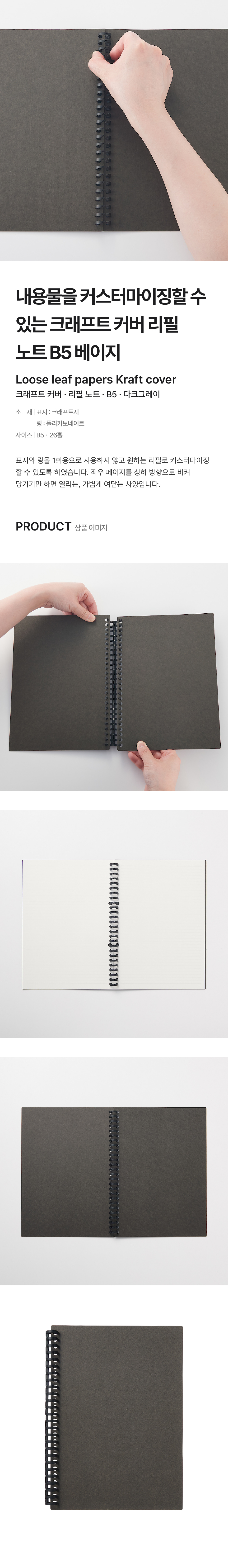 리필 노트ㆍ크래프트 커버 다크그레이 B5ㆍ26홀/4550182913835