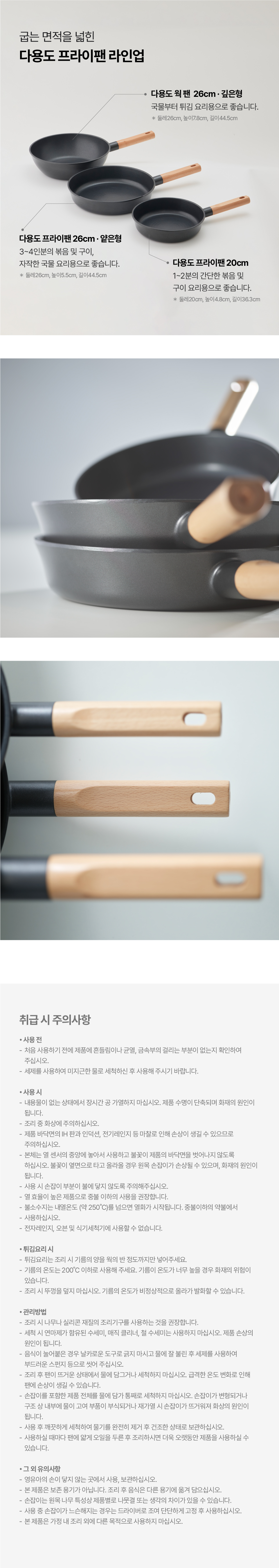 조리 시 나무나 실리콘 재질의 조리기구를 사용하면 더욱 오랫동안 제품을 사용하실 수 있습니다.세척 시 연마제가 함유된 수세미, 매직 클리너, 철 수세미는 사용하지 마십시오. 제품 손상의 원인이 됩니다.음식이 눌어붙은 경우 날카로운 도구로 긁지 마시고 물에 잘 불린 후 세제를 사용하여 부드러운 스펀지 등으로 씻어 주십시오.조리 후 팬이 뜨거운 상태에서 물에 담그거나 세척하지 마십시오. 급격한 온도변화로 인해 팬에 손상이 생길 수 있습니다.손잡이를 포함한 제품 전체를 물에 담궈 통째로 세척하지 마십시오. 손잡이가 변형되거나 구조 상 내부에 물이 고여 부품이 부식되거나 재가열 시 손잡이가 뜨거워져 화상의 원인이 됩니다. 사용 중 나사가 느슨해지는 경우 드라이버로 나사를 조여주십시오. 사용 후 깨끗하게 세척하여 물기를 완전히 제거 후 건조한 상태로 보관하십시오. 사용하실 때마다 팬에 얇게 오일을 두른 후 조리하시면 더욱 오랫동안 제품을 사용하실 수 있습니다.영유아의 손이 닿지 않는 곳에서 사용,보관하십시오.본 제품은 보존용기가 아닙니다. 조리 후 음식은 다른 용기에 옮겨 담으십시오.손잡이는 원목 나무 특성상 제품별로 나뭇결 또는 색상의 차이가 있을 수 있습니다.사용 중 손잡이가 느슨해지는 경우는 드라이버로 조여 단단하게 고정 후 사용하십시오.소비자 과실로 인한 인적, 물적, 재산 상 피해는 당사에서 책임 지지않으므로 사용 시 주의를 기울여 주십시오. 본 제품은 가정 내 조리 외에 다른 목적으로 사용하지 마십시오.