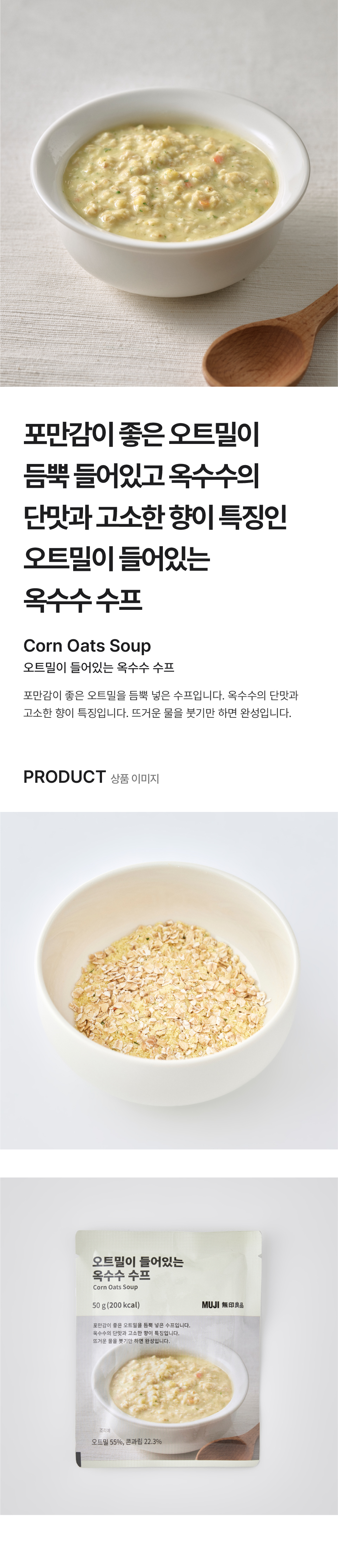 원재료명 및 함량 : 곡류가공품(귀리:캐나다산), 콘과립{스위트콘스프조제분(뉴질랜드산), 골드뉴밀키(정제팜유: 말레이시아산), 감자전분, 팜쇼트닝, 치킨스톡분말}, 가공유크림{유크림(호주산), 유당(미국산), 카제인나트륨, 제이인산칼륨, 유화제}, 곡류가공품, 복합조미식품, 정제소금, 설탕, 덱스트린, 건당근후레이크, 파슬리후레이크, 효모식품, 터메릭분말, 백후추
