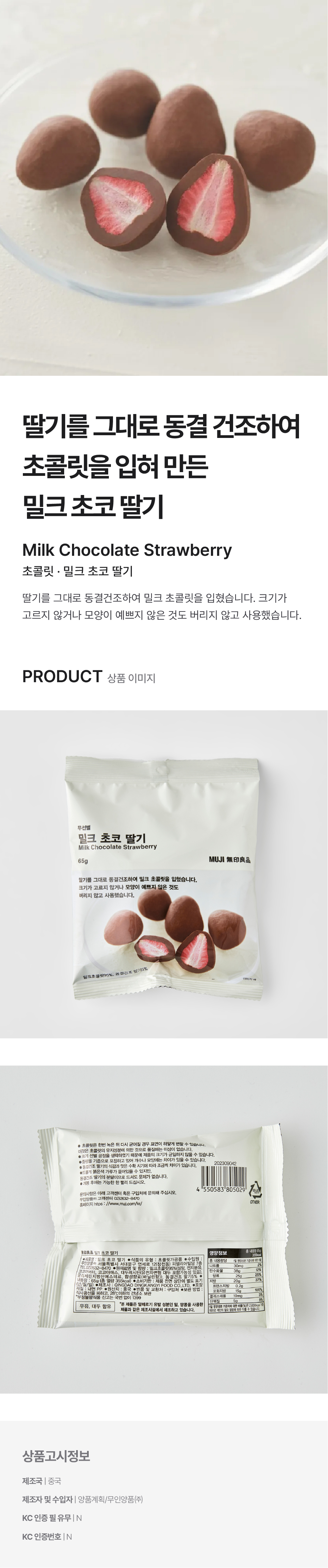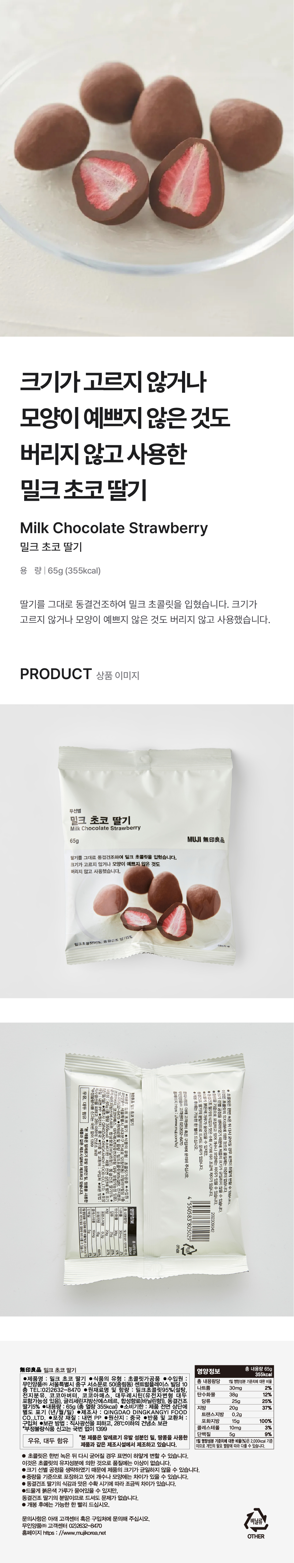 원재료명 및 함량 : 밀크초콜릿95%(설탕, 전지분유, 코코아버터, 코코아매스, 대두레시틴(유전자변형 대두 포함가능성 있음), 글리세린지방산에스테르, 합성향료(바닐린항)), 동결건조 딸기5%