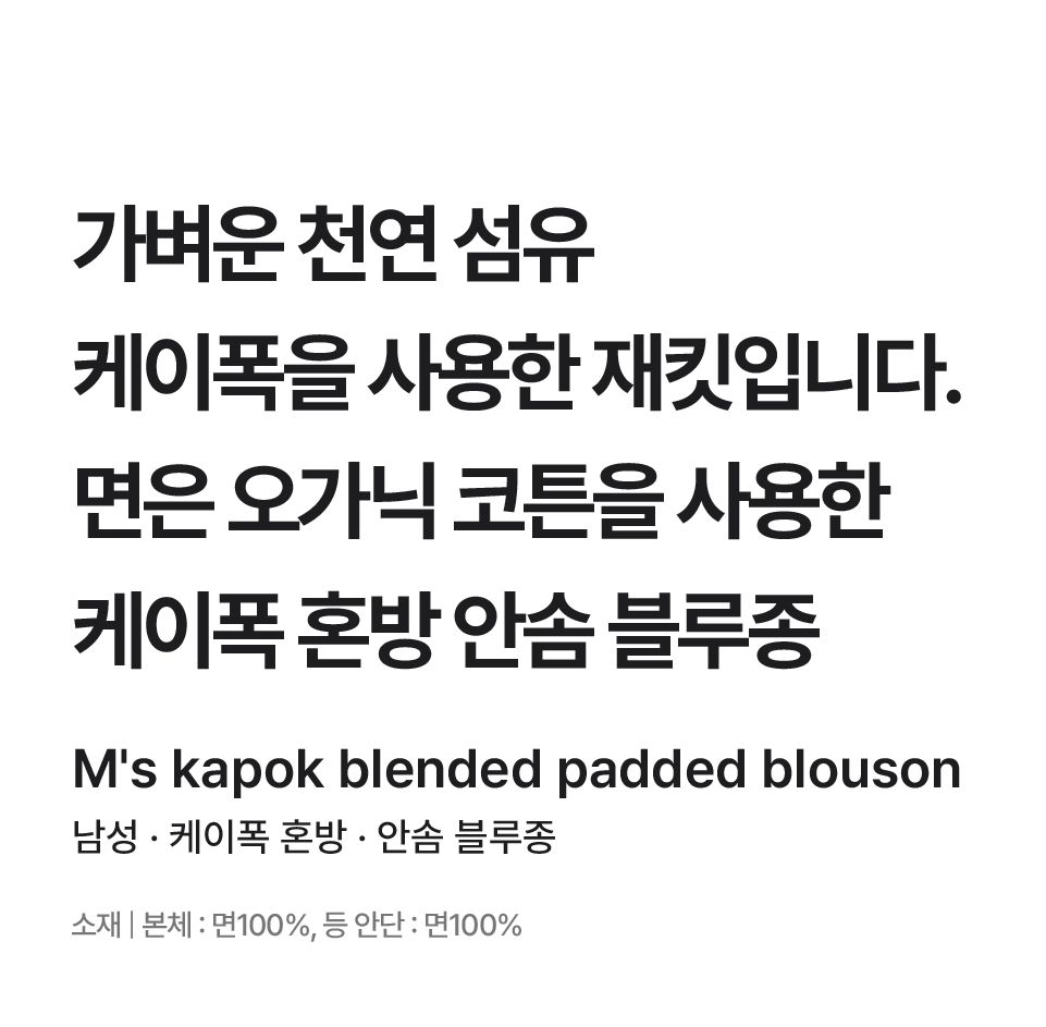 겉감:면45%폴리에스터40%케이폭(지정외섬유)15%안감:폴리에스터100%충전재:폴리에스터80%리오셀20%리브부분:폴리에스터94%폴리우레탄6%