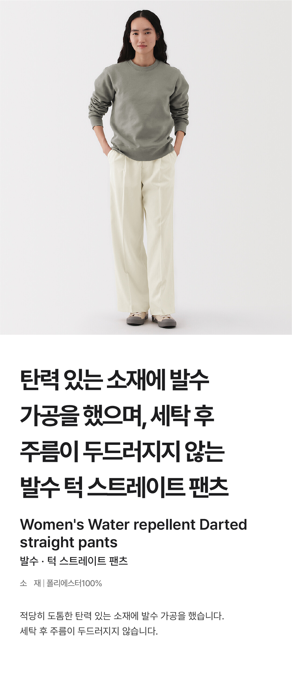●짙은 색상 제품은 사용 중 마찰이나 젖은 상태에서의 접촉으로 이염될 수 있습니다. 세탁할 때는 단독 세탁하여 주시기 바랍니다. ●발수(물을 튕기기 쉬운 성질) 세탁, 클리닝에 의해 서서히 발수 효과가 사라집니다. ●소재의 특성상 걸림에 주의 바랍니다. ●이 상품은 본체에 재생 폴리에스터를 30% 사용했습니다. ●본 제품의 센터 프레스는 영구적인 것이 아니라 착용 및 세탁에 의해 펴질 수 있으니 양해하여 주시기 바랍니다.