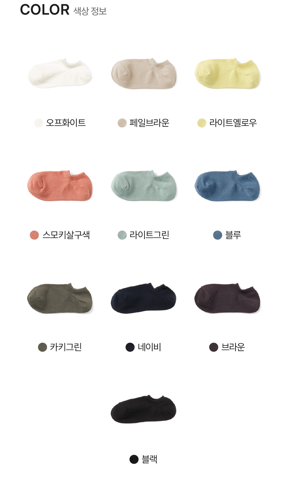 오프화이트,블랙,라이트그린,카키그린,블루,네이비,페일브라운,브라운,스모키살구색,라이트옐로우