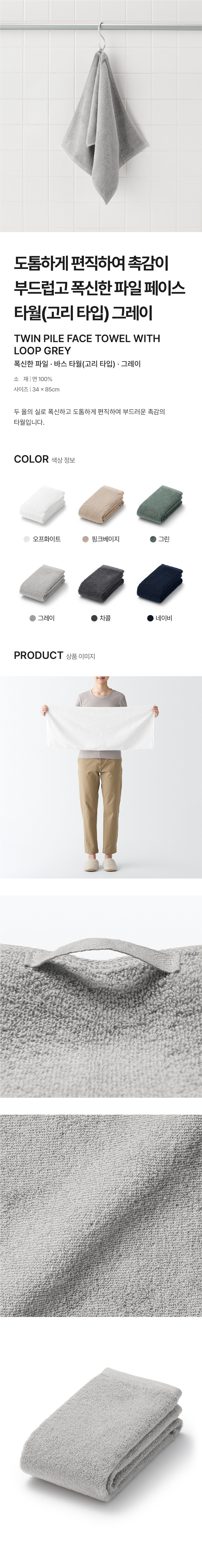 폭신한 파일 페이스 타월(고리 타입) 그레이 34x85cm/4550584705588