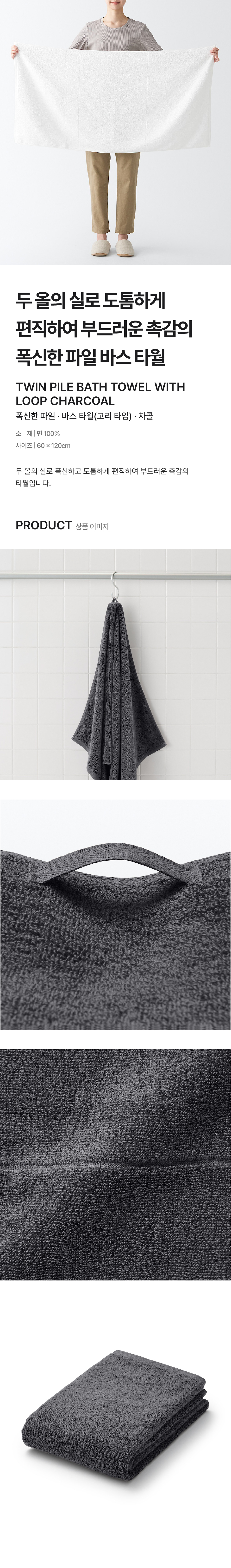 폭신한 파일 바스 타월(고리 타입) 차콜 60x120cm/4550584229992