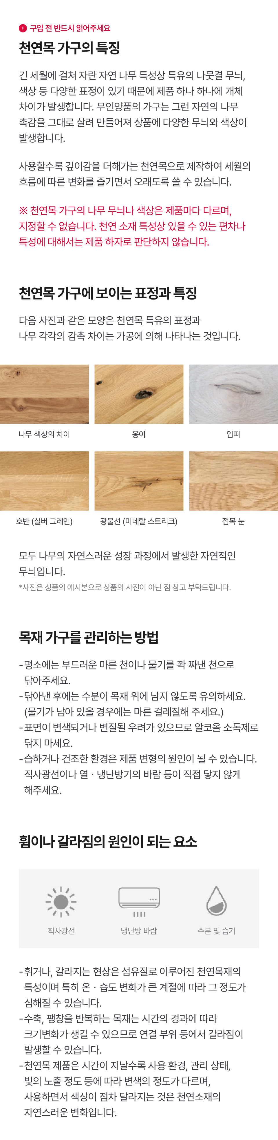 1.설치장소는 습기가 많은 곳을 피하여 수명을 유지하도록 바닥을 조정할 것 2.직사광선 또는 열을 피할 것 3.이동시 끌지말고 들어서 이동할 것 4.문 개폐 시 문틈이나 경첩에 신체 또는 의류 등이 끼지 않도록 주의할 것 5.포름알데하이드 및 휘발성유기화합물(VOCs)이 방출될 수 있는 제품은 인체에 유해할 수 있으니, 환기가 잘되는 공간에서만 사용할 것 6. 오염 시 마른수건이나 기타 부드러운 천으로 닦을 것 7. 모서리에 부딪쳐 다칠 수 있으니 주의할 것, “가구에서 떨어지거나 넘어지지 않도록 주의 할 것” 8. 가구가 넘어지는 사고가 발생할 수 있으니 제조사에서 제공하는 벽고정장치가 있는 경우 반드시 벽에 고정하여 사용할 것 9. 어린이가 가구본체 또는 부속품을 밟고 올라서거나 매달리지 않도록 주의할 것.