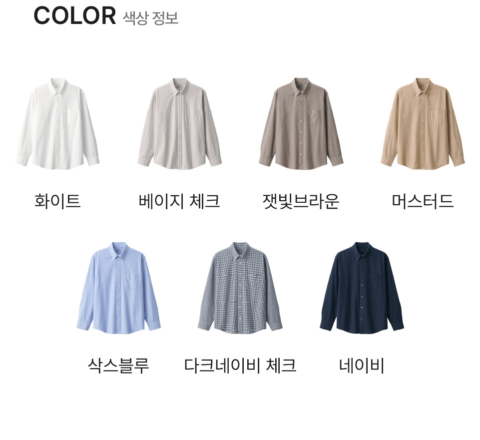 화이트,머스터드,삭스블루,네이비,잿빛브라운,베이지 체크,다크네이비 체크